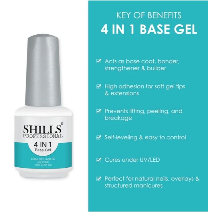 The Shills Professional 4 in 1 Base Gel is a multi-purpose nail product designed to simplify your manicure routine by combining four functions in one bottle: